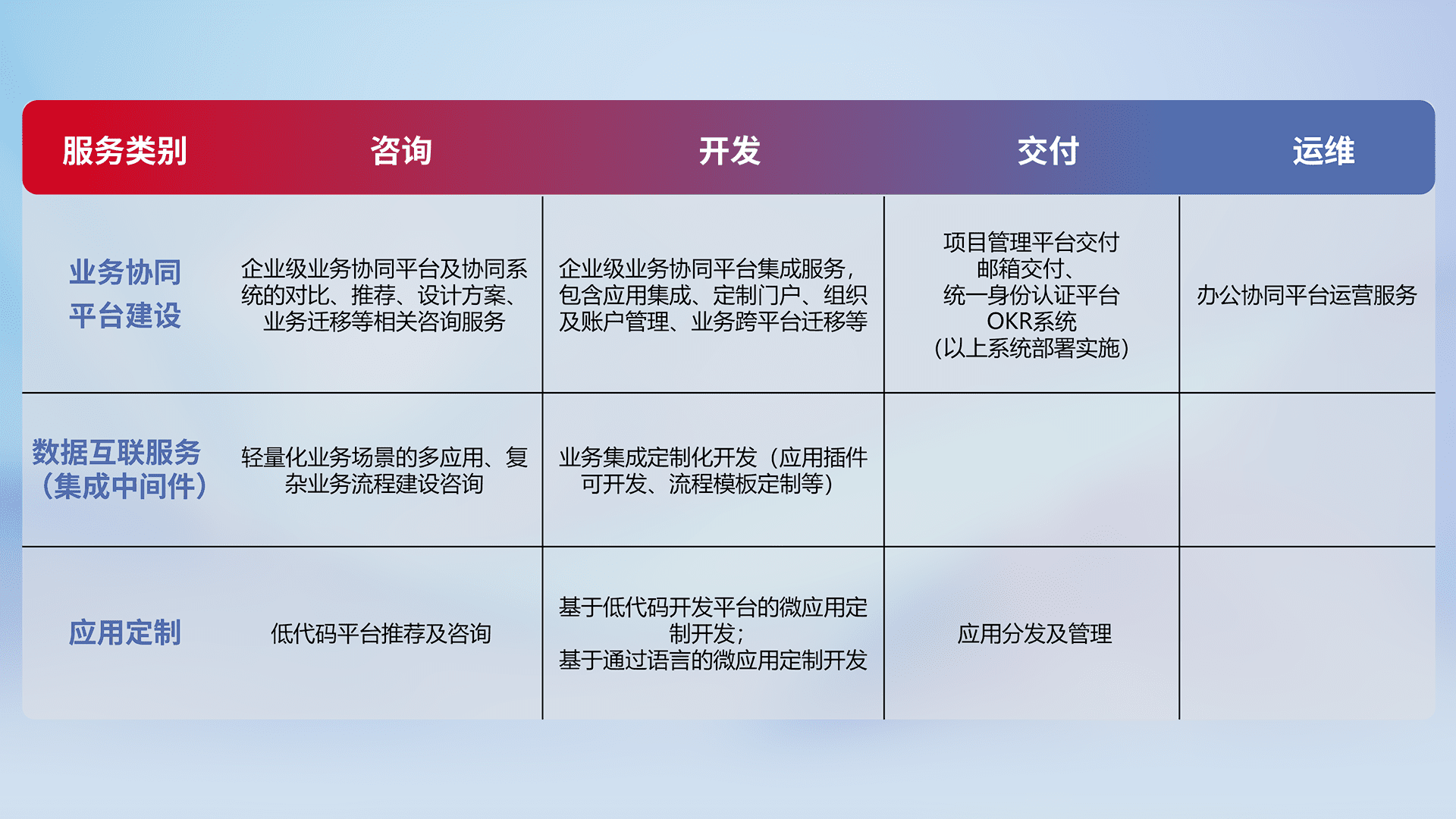 针对钉钉、、、企微、、IDaas等平台级产品提供产品的规划、、、方案、、、交付、、定制化开发等服务,,,,实现如统一协同办公、、、智能客户服务、、混合会议管理、、、智能数据查询、、、等业务场景,,,实现数字化转型。。